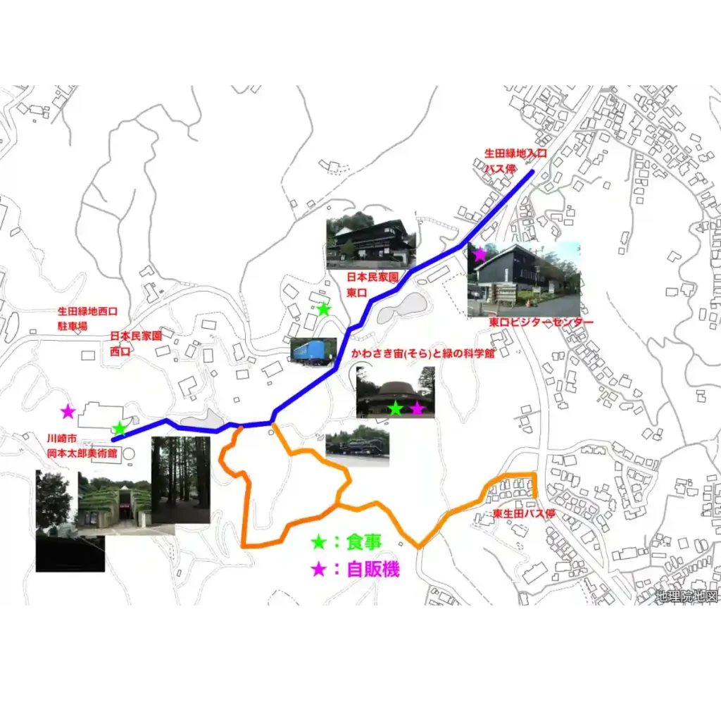 生田緑地入口バス停から、美術館への道筋は以下の通りで、生田緑地入口から東口ビジターセンター、日本民家園、かわさき宙とみどりの科学館をみながら、青色の線をなぞって一本道で到着する。美術館を目指す場合は途中の脇道にそれないようにすること、脇道から山に誘導される分かれ道も多々ある。